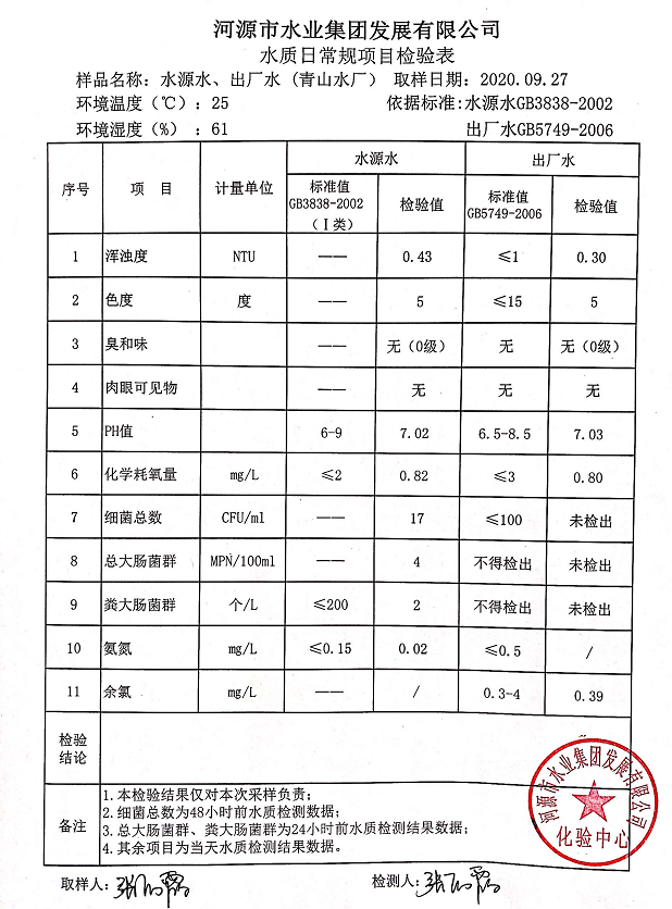 2020年9月27日水質(zhì)檢驗(yàn)報(bào)告