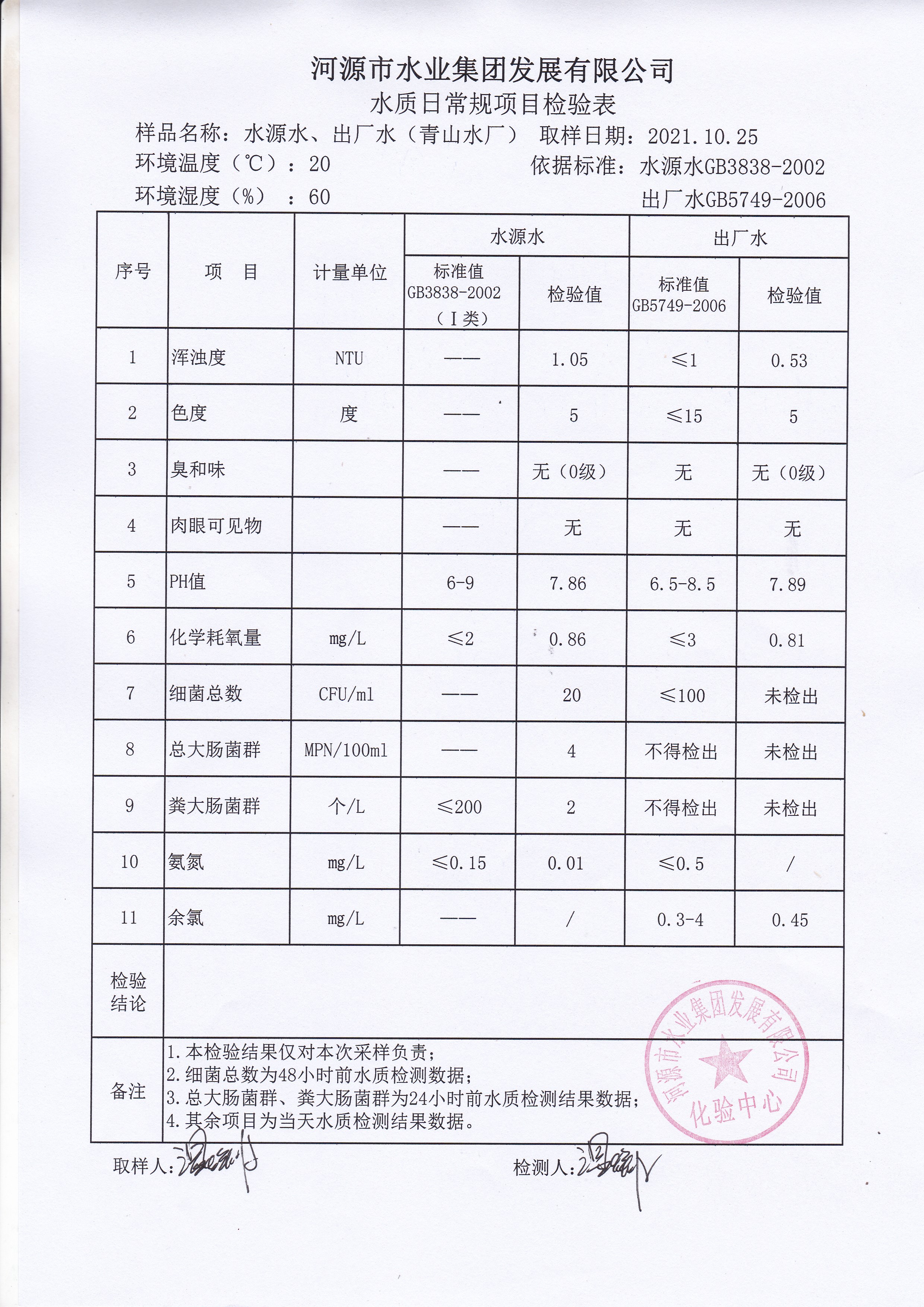 2021年10月25日水質(zhì)檢驗報告